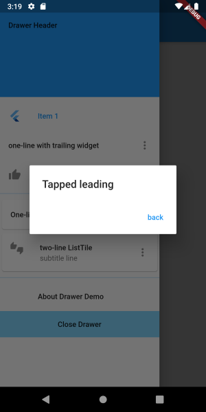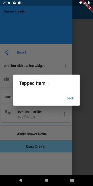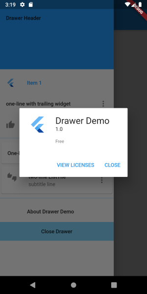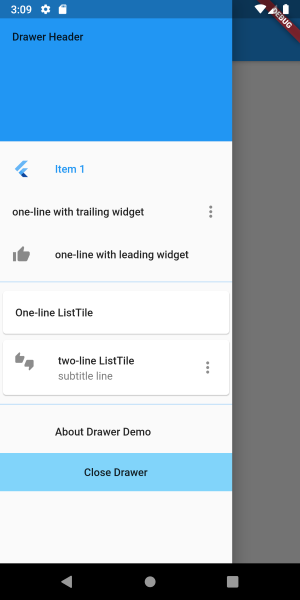 Drawer 에는 DrawerHeader, ListTile, Divider, Card, AboutListTile 등을 배치해 꾸며보았다.