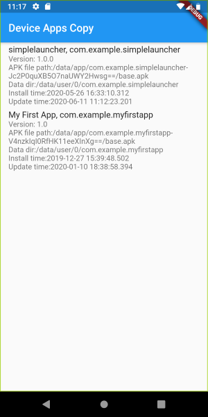 "Version: ${apps[position]['version_name']}\nAPK file path:${apps[position]['apk_file_path']}\nData dir:${apps[position]['data_dir']}\nInstall time:${DateTime.fromMillisecondsSinceEpoch(apps[position]['install_time']).toString()}\nUpdate time:${DateTime.fromMillisecondsSinceEpoch(apps[position]['update_time']).toString()}"),