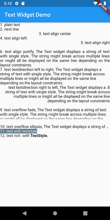 The Text widget displays a string of text with single style. The string might break across multiple lines or might all be displayed on the same line depending on the layout constraints.