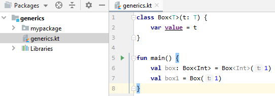 val box = Box(1) // 1 has type Int, so the compiler figures out that we are talking about Box<Int>