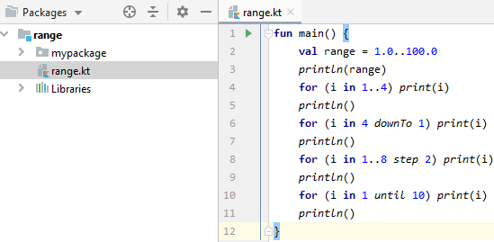 특정 범위의 값(range of values) 을 생성하는 방법에는 kotlin.ranges 패키지에 있는 rangeTo() 함수가 있으며 이 함수의 연산자 인 .. 를 사용한다.