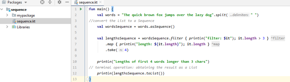 val lengthsSequence = wordsSequence.filter { println("filter: $it"); it.length > 3 }