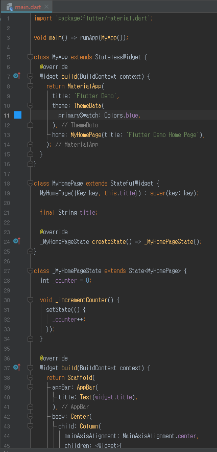 flutter create (플러터 새 프로젝트 생성) 명령을 통해 새로 생성된 프로젝트 코드에는 친절한 코멘트가 포함되어 있습니다.